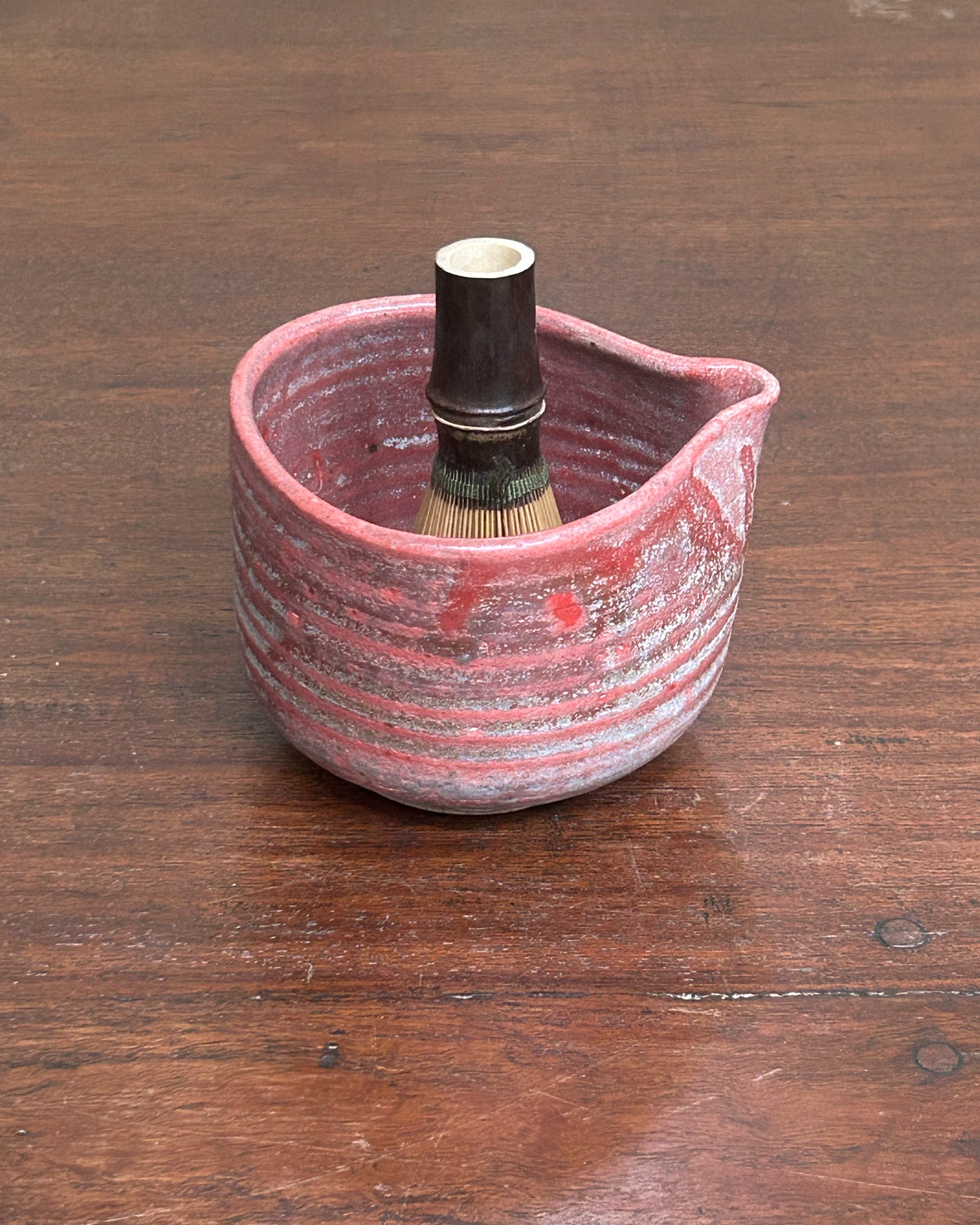 This chawan has an uneven bottom from the firing process, which may cause it to feel slightly wobbly on a flat surface. It is fully intact, food-safe, and does not leak. When whisking matcha, the bowl should be gently held in the hand to ensure stability. This characteristic reflects the individuality and wabi-sabi nature of the piece.